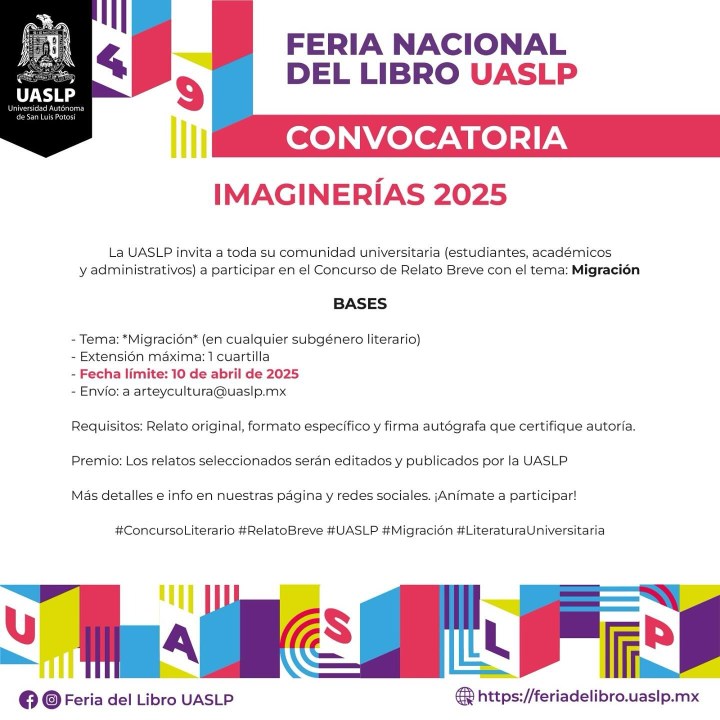 La Universidad Autónoma de San Luis Potosí (UASLP), en el marco de la 49ª edición de la Feria Nacional del Libro (FNL), invita a la comunidad universitaria a participar en el concurso de relato breve «Imaginerías 2025», anunció Patricia Flores Blavier, directora de Fomento Editorial y Publicaciones y coordinadora del evento editorial.