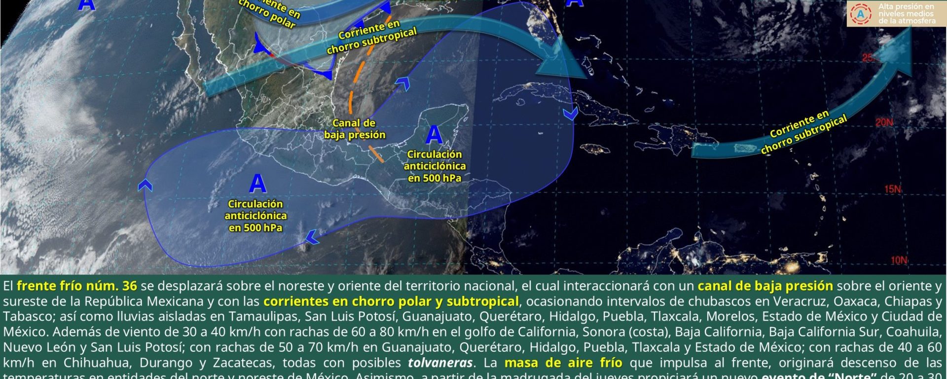 Evento de “Norte” de 40 a 60 km/h con rachas de 80 a 100 km/h: istmo y golfo de Tehuantepec; de 40 a 50 km/h con rachas de 70 a 90 km/h: Veracruz; de 30 a 40 km/h con rachas de 60 a 80 km/h: Tamaulipas; y de 20 a 30 km/h con rachas de 50 a 70 km/h: Tabasco, Campeche, Yucatán y Quintana Roo (norte).