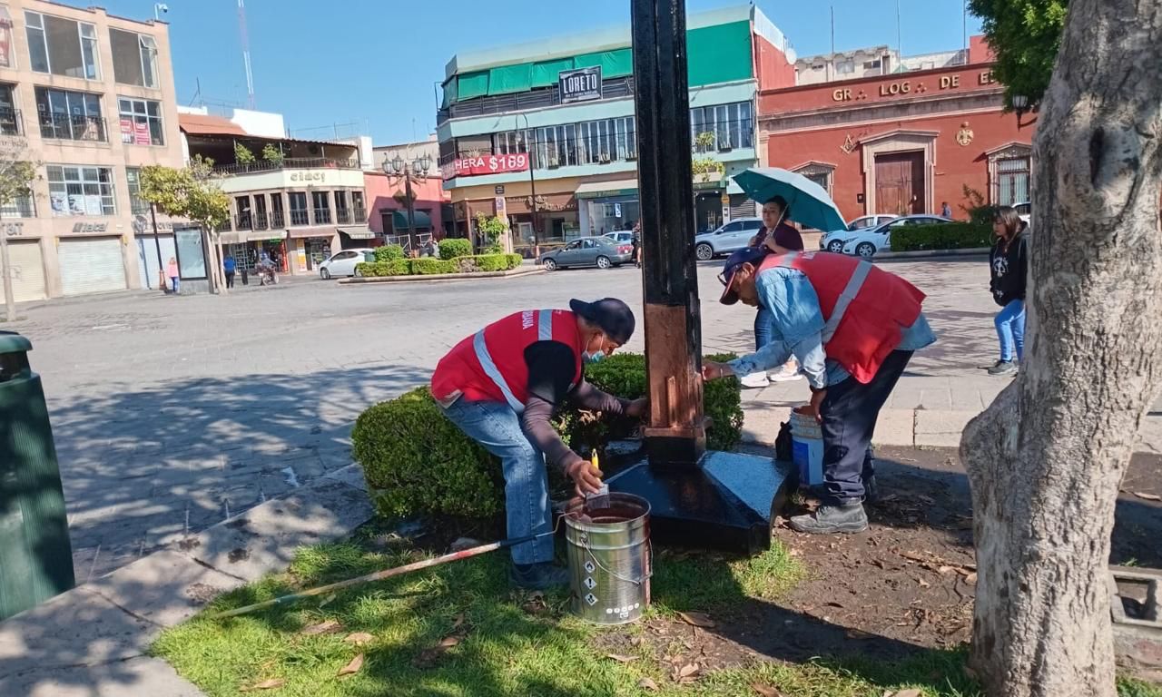 Después de dar mantenimiento a calles y mobiliario urbano, continúa con la pintura de postes en el primer cuadro de la ciudad