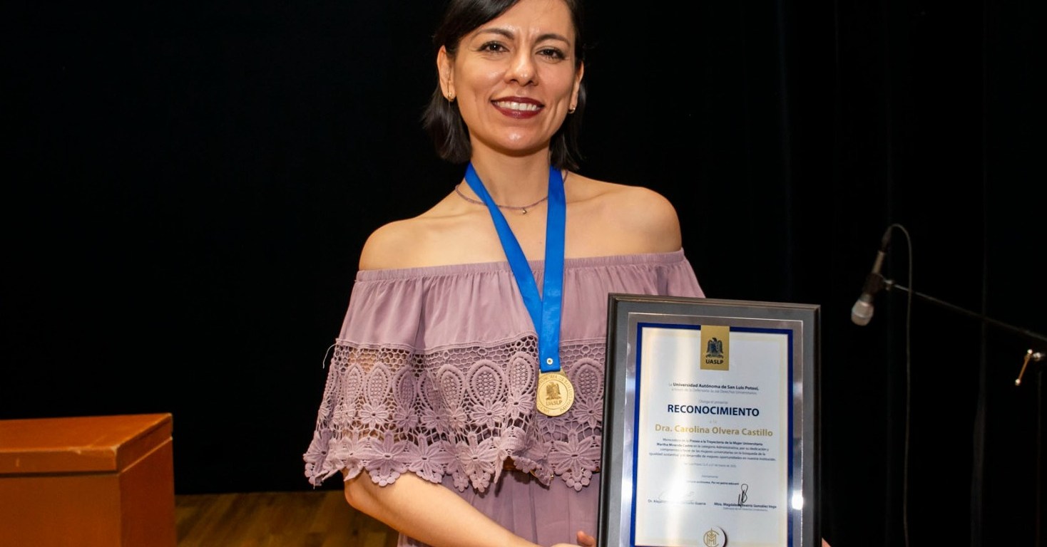 La doctora Carolina Olvera Castillo, secretaria general de la Facultad de Psicología de la Universidad Autónoma de San Luis Potosí (UASLP), y galardonada con la Presea a la Trayectoria de la Mujer Universitaria “Martha Miranda Castro” en la categoría Administrativa, dijo que, para ella, es un incentivo al trabajo de muchas mujeres que, durante años, han realizado una labor constante con compromiso ético y profesional.