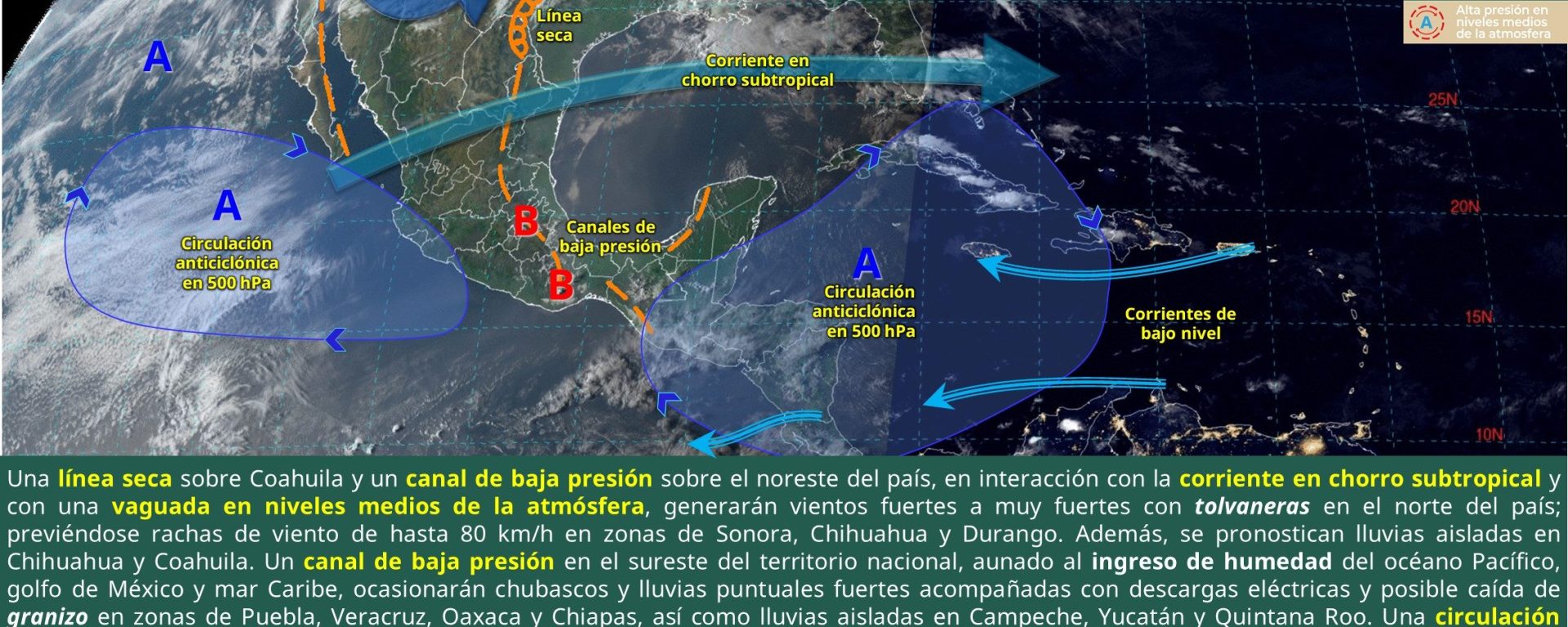 Viento de 20 a 30 km/h con rachas de 40 a 60 km/h: Tamaulipas, Veracruz, Tabasco, Oaxaca, Chiapas, Campeche, Yucatán y Quintana Roo; con posibles tolvaneras: Coahuila, Nuevo León y San Luis Potosí.