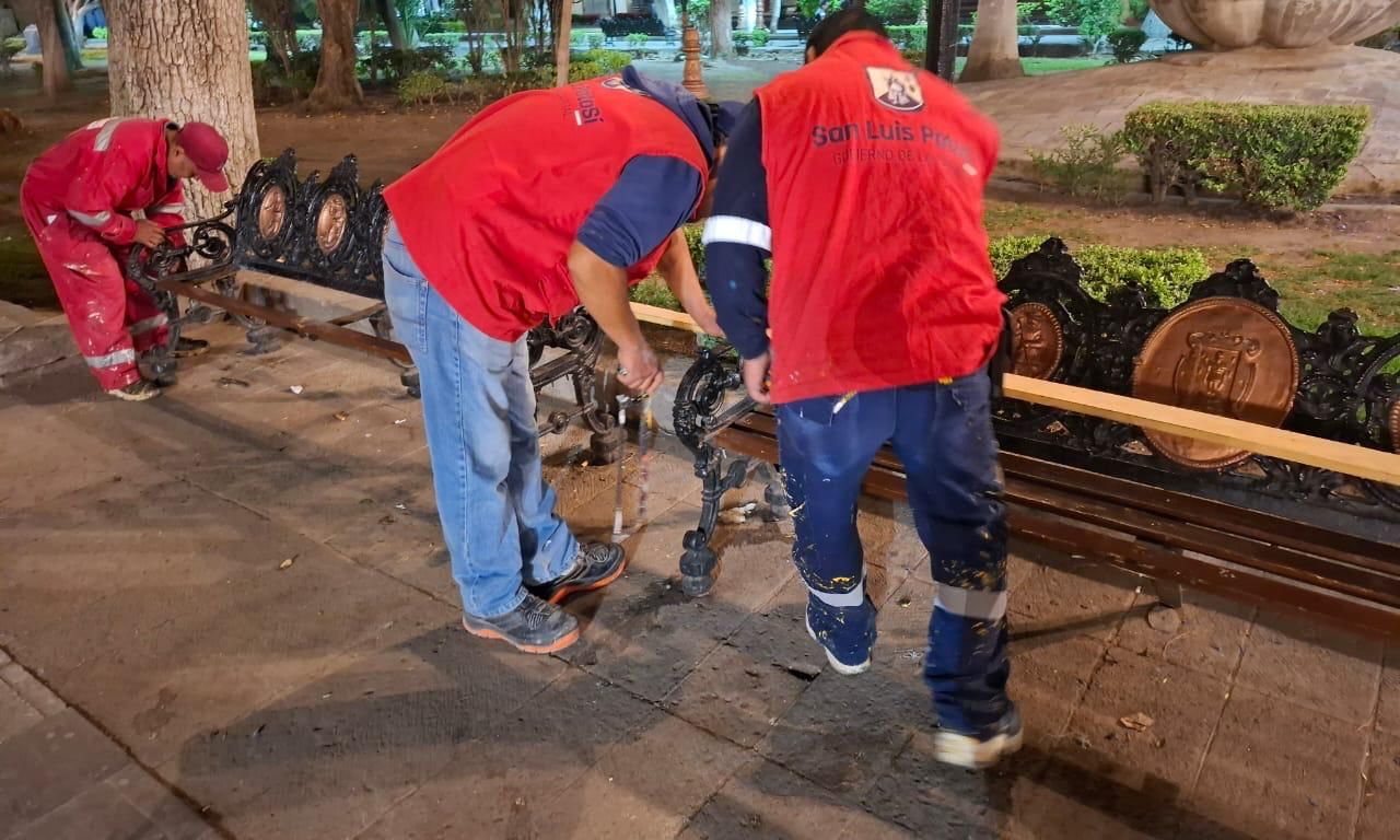 Personal de la Dirección de Servicios Municipales labora actualmente en el arreglo y pintura de bancas en la Plaza de Armas y en la zona peatonal de la calle Zaragoza, además de estar al pendiente de cualquier desperfecto que pudieran detectar para proceder a su reparación.