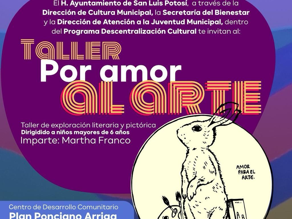 La Dirección de Cultura y la Secretaría del Bienestar, a través de su programa de descentralización cultural, presentan “Por Amor para el Arte”, un taller de exploración multidisciplinaria que fusiona pintura y literatura, mismo que se llevará a cabo cada miércoles, a partir del 2 de abril, en un Centro de Desarrollo Comunitario distinto, indicó Héctor Ulises Tello Balderas, encargado de la Dirección de Cultura Municipa.