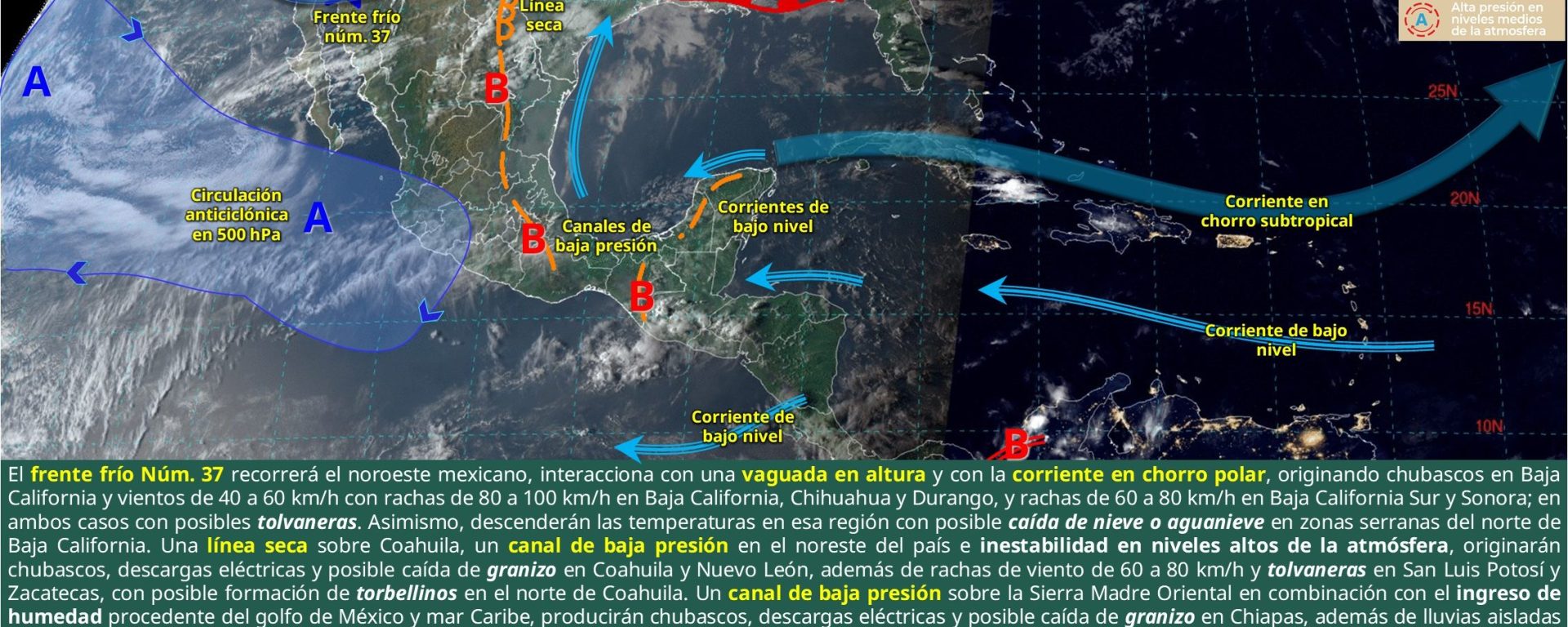 Cielo medio nublado durante el día, con probabilidad de lluvias aisladas en Chihuahua. Cielo parcialmente nublado y sin lluvia en el resto de la región. Por la mañana, ambiente muy frío a gélido en zonas serranas de Durango, con posible caída de nieve o aguanieve en sierras de Chihuahua. En el resto de la región, ambiente fresco a templado durante la mañana y muy caluroso por la tarde, prevaleciendo la onda de calor en Nuevo León (suroeste y sur) y San Luis Potosí (norte, centro, sur y este). Viento de componente sur de 50 a 70 km/h con rachas de 100 a 120 km/h en Chihuahua y Durango; rachas de 70 a 90 km/h en Coahuila y Zacatecas; de 60 a 80 km/h en Nuevo León; y rachas de 50 a 70 km/h en San Luis Potosí y Aguascalientes; todas con posibles tolvaneras.
