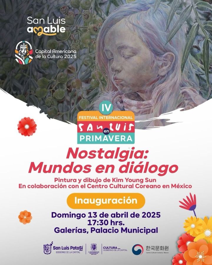 El Gobierno de la Capital, a través de la Dirección de Cultura Municipal, en colaboración con el Centro Cultural Coreano en México, invita al público potosino a la inauguración de la exposición Nostalgia: mundos en diálogo. Pintura y dibujo de Kim Young Sun, el próximo domingo 13 de abril a las 17:30 h, en las Galerías del Centro Cultural Palacio Municipal, como parte del IV Festival Internacional San Luis en Primavera.