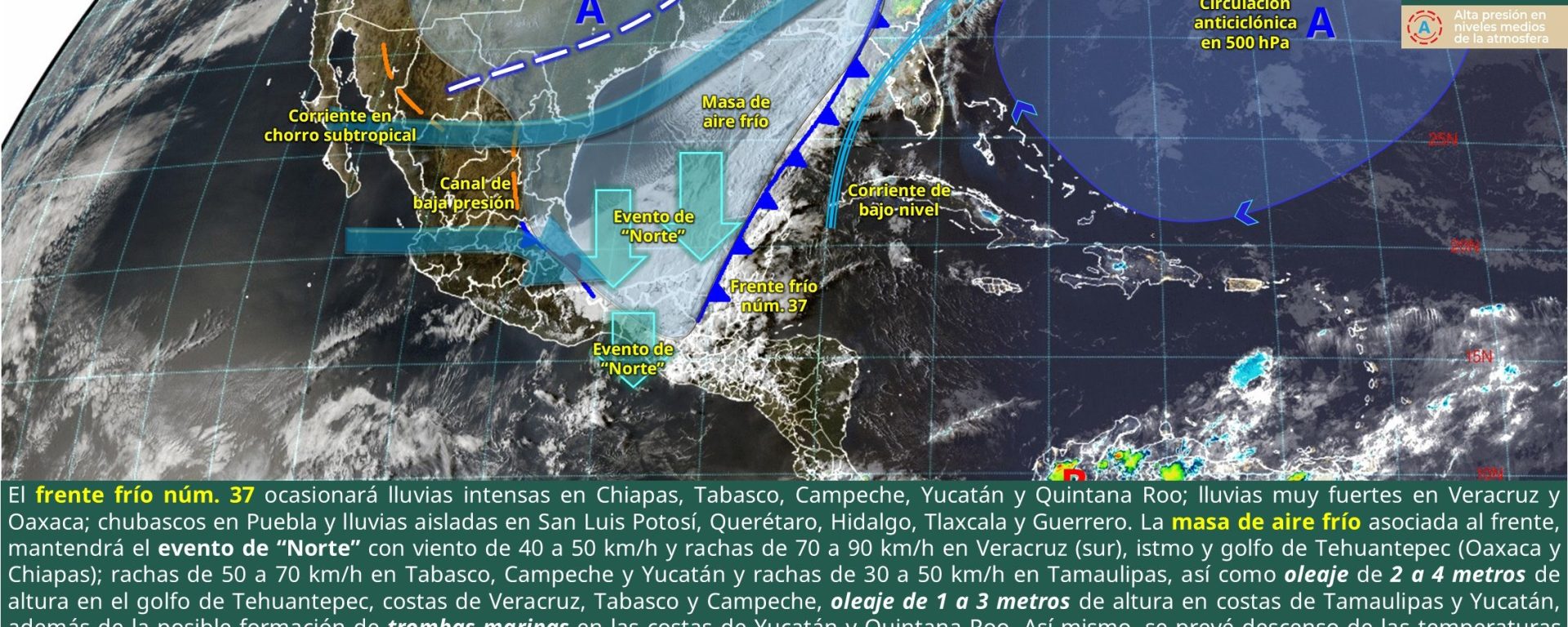 Evento de “Norte” con viento de 40 a 60 km/h y rachas de 80 a 100 km/h: istmo y golfo de Tehuantepec (Oaxaca y Chiapas); y de 20 a 30 km/h con rachas de 40 a 60 km/h: Veracruz (sur), Tabasco, Campeche, Yucatán y Quintana Roo. Disminuyendo por la noche.