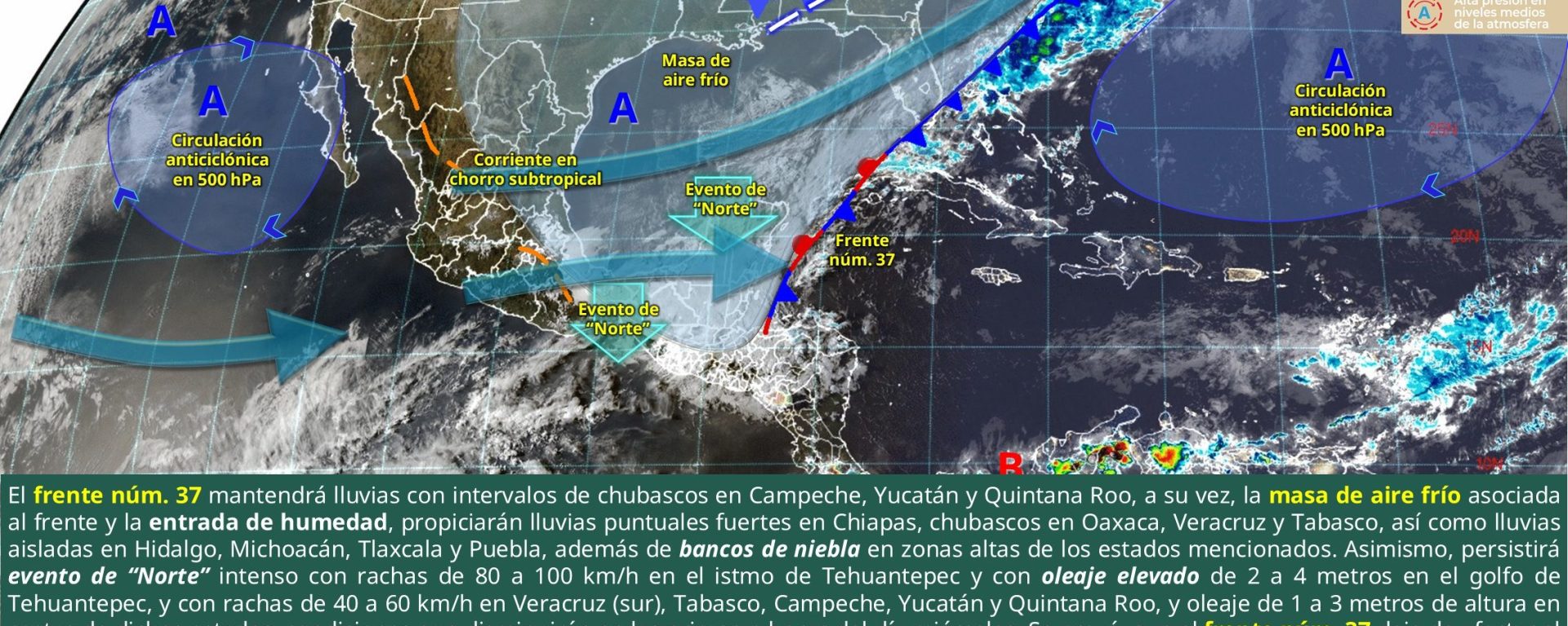 Viento de componente norte de 30 a 40 km/h y rachas de 60 a 80 km/h: istmo y golfo de Tehuantepec (Oaxaca y Chiapas); y de 10 a 20 km/h con rachas de 30 a 50 km/h: Campeche, Yucatán y Quintana Roo.