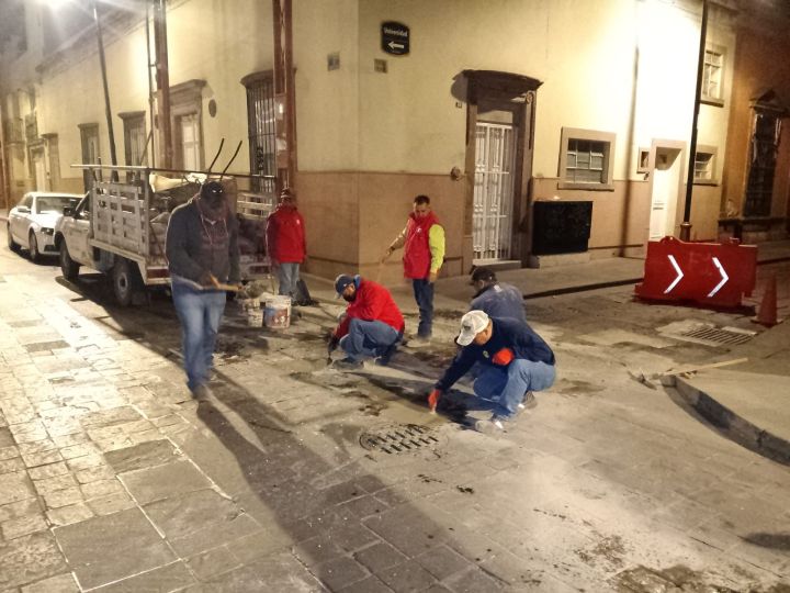 Como parte del Programa de Bacheo Emergente, el Gobierno Municipal de San Luis Potosí, a través de la Dirección de Obras Públicas, llevó a cabo trabajos nocturnos de reposiciones de adoquín en la calle de Universidad esquina con Morelos, en el Centro Histórico.