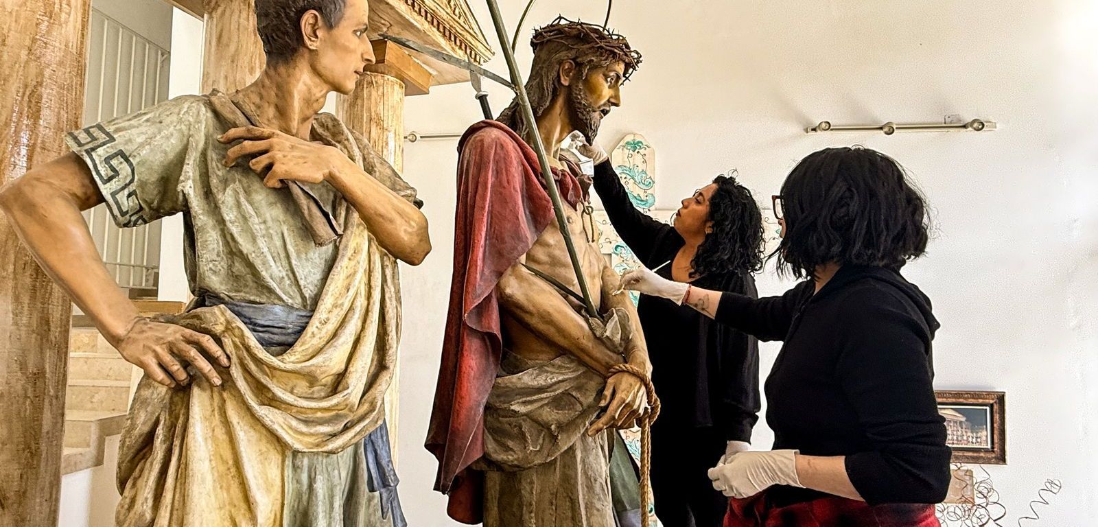 En respuesta a la solicitud de la asociación civil, personal especializado en conservación y restauración de UGCH, realizó trabajos de limpieza y mantenimiento en las imágenes que formarán parte del Viacrucis viviente con el objetivo de asegurar su adecuado estado para el recorrido procesional.
