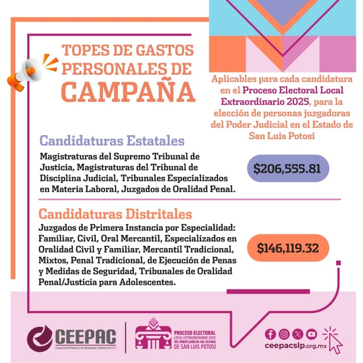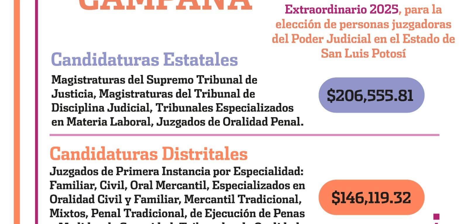 El límite máximo de gastos de campaña para Candidaturas Estatales a contender en el proceso electoral del poder judicial es de $206 mil, 555.81 pesos y para las Candidaturas Distritales es de $146 mil,119.32 pesos.