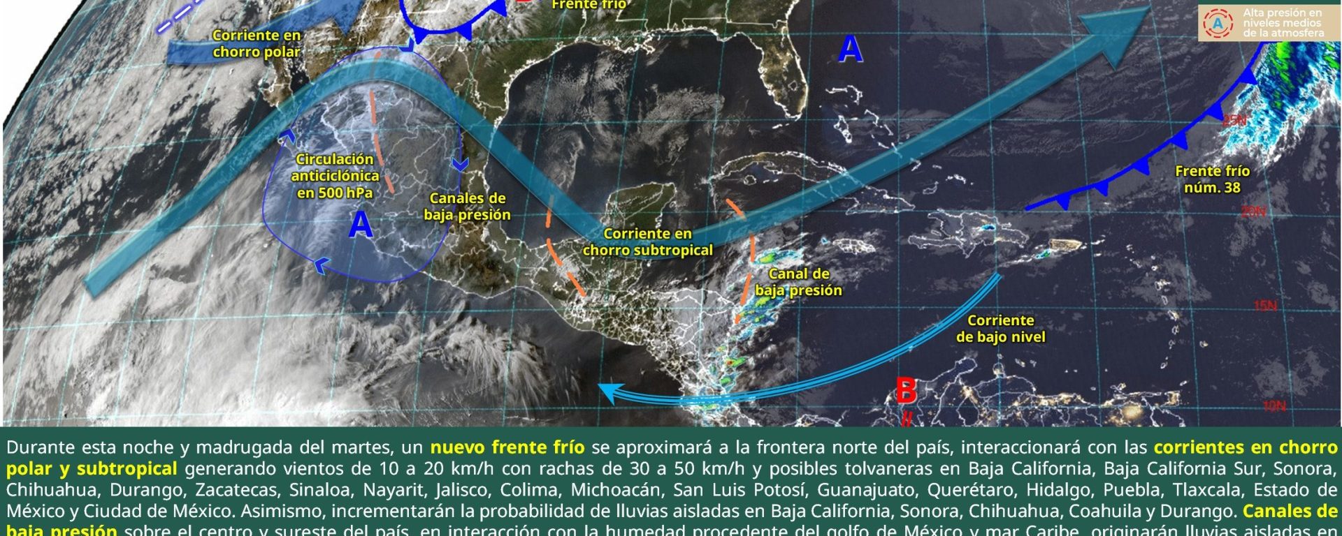 Viento de 20 a 30 km/h con rachas de 50 a 70 km/h y tolvaneras: Sonora, Chihuahua, Coahuila, Nuevo León, Tamaulipas, San Luis Potosí, Zacatecas, Aguascalientes, Jalisco, Guanajuato, Querétaro, Hidalgo, Puebla y Tlaxcala.