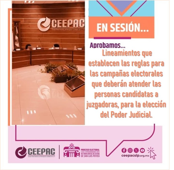 El Consejo Estatal Electoral y de Participación Ciudadana (CEEPAC) emitió los Lineamientos que establecen las reglas para las campañas electorales que deberán atender las personas candidatas a juzgadoras, en el Proceso Electoral Local Extraordinario 2025 del Poder Judicial del Estado.