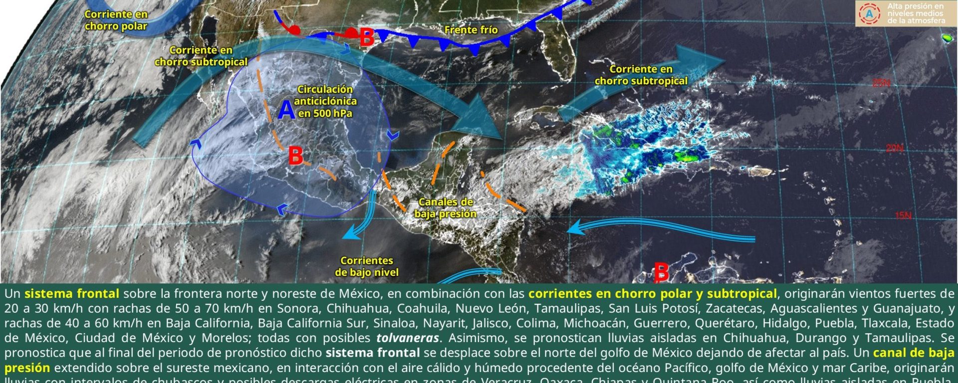 Viento de 30 a 40 km/h con rachas de 60 a 80 km/h y tolvaneras: Baja California, Sonora y Chihuahua; y viento de 10 a 20 km/h con rachas de 40 a 50 km/h y posibles tolvaneras: Baja California Sur.