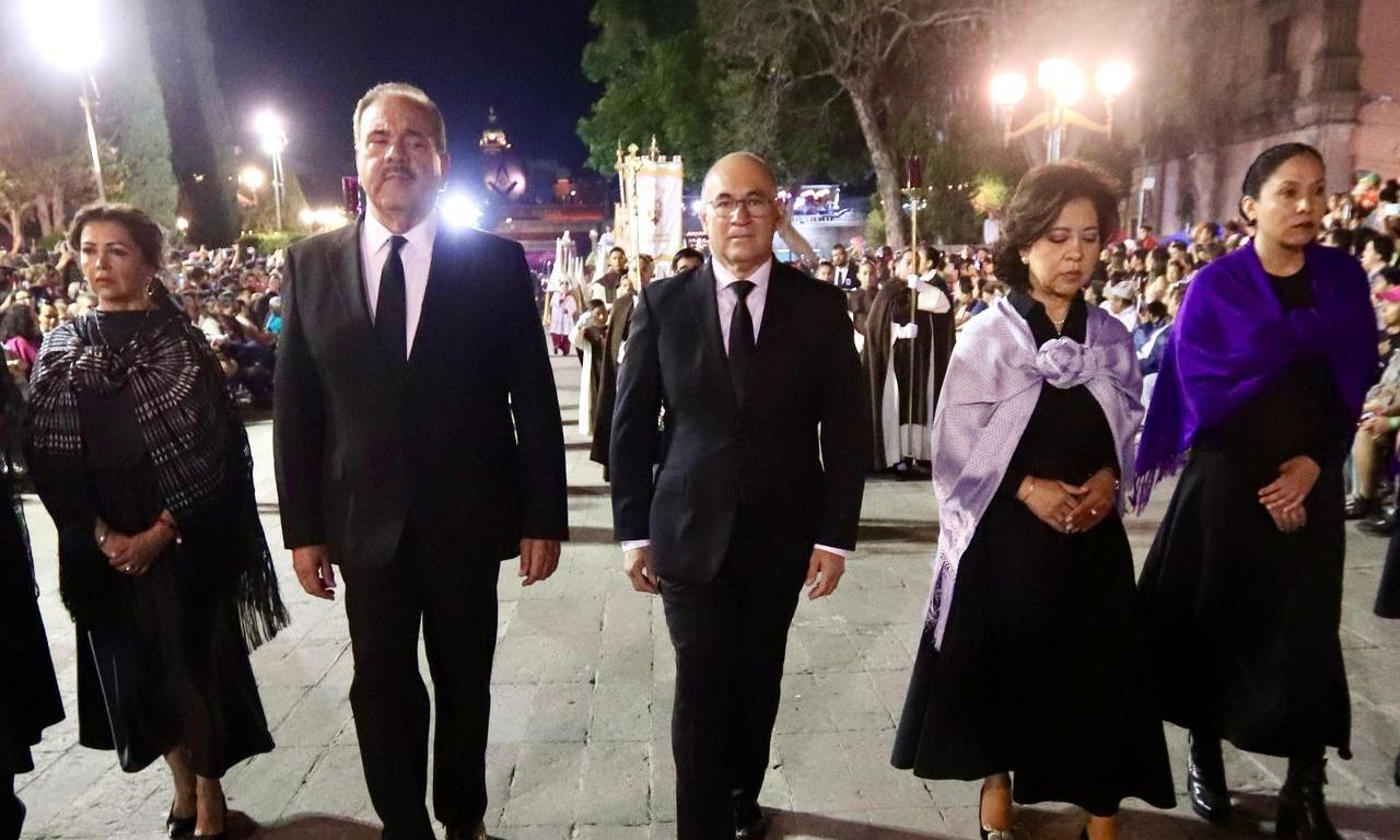 Como lo establece el protocolo, el Presidente Municipal Enrique Galindo Ceballos escuchó el toque de la Guardia Pretoriana a las puertas de la Iglesia del Carmen y, posteriormente, abrió las puertas del templo para dar inicio al recorrido encabezado por la imagen de la Virgen de la Soledad. Lo acompañó la presidenta del DIF Municipal, Estela Arriaga Márquez, con quien previamente acudió a la capilla de la Virgen para unirse en oración junto a miles de fieles.