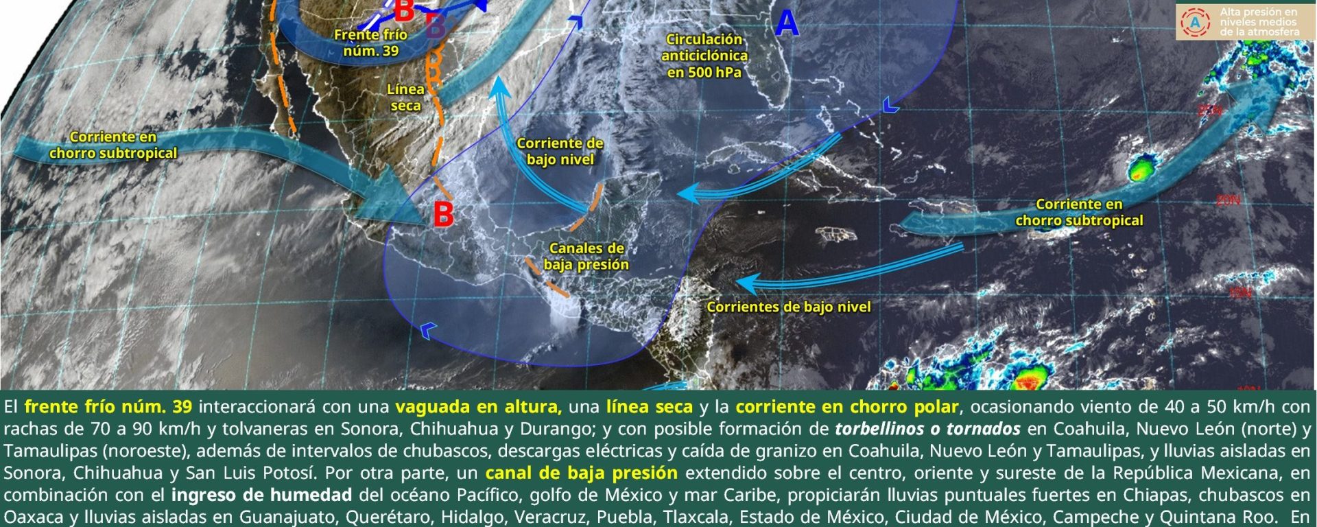 Viento de 30 a 40 km/h con rachas de 50 a 70 km/h: Campeche, Yucatán y Quintana Roo; con tolvaneras: San Luis Potosí, Querétaro e Hidalgo; y con posible formación de torbellinos: Coahuila, Nuevo León y Tamaulipas.