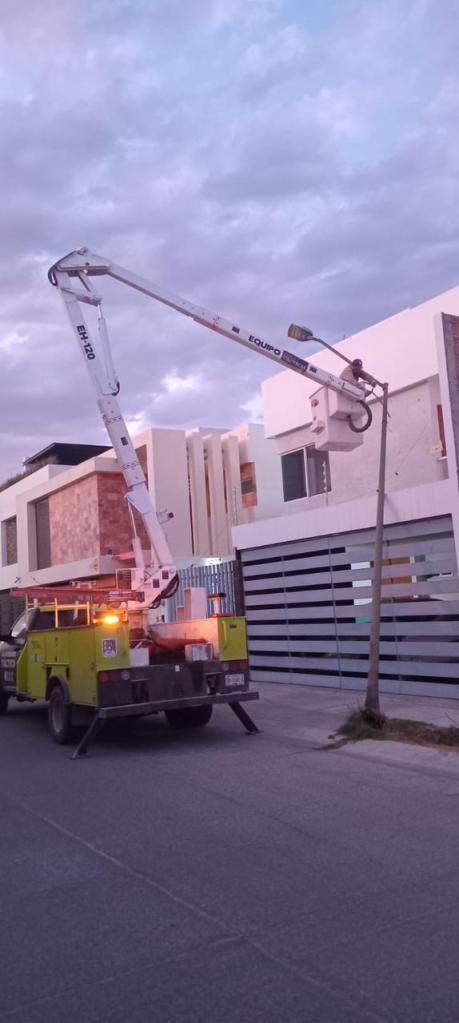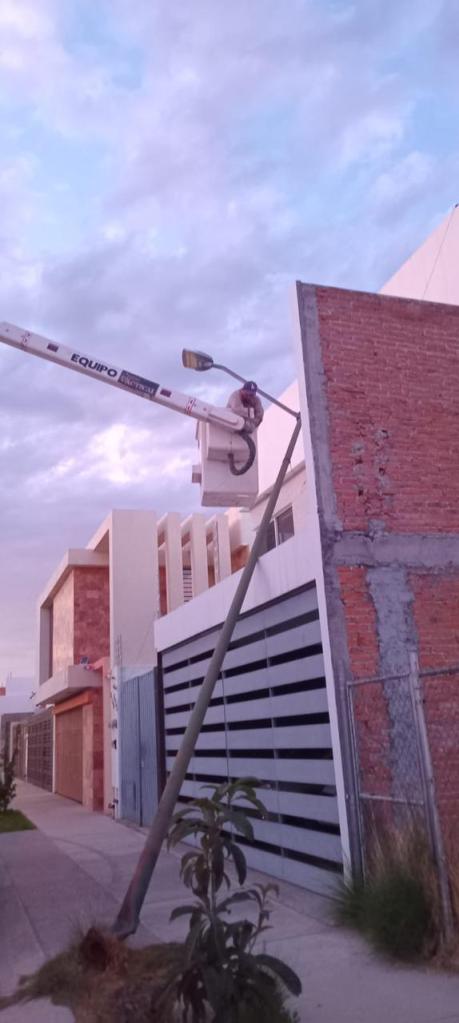 El reporte atendido por el área de alumbrado, se intervino en la calle de Villa Aurea número 650 del fraccionamiento Villa Magna al norponiente de la ciudad capital, a través del reporte realizado por los vecinos de la vivienda, en el que luego de que se generó un impacto contra el poste por parte de un vehículo, este se dañó considerablemente y se recargo en la vivienda con un alto riesgo para las personas.