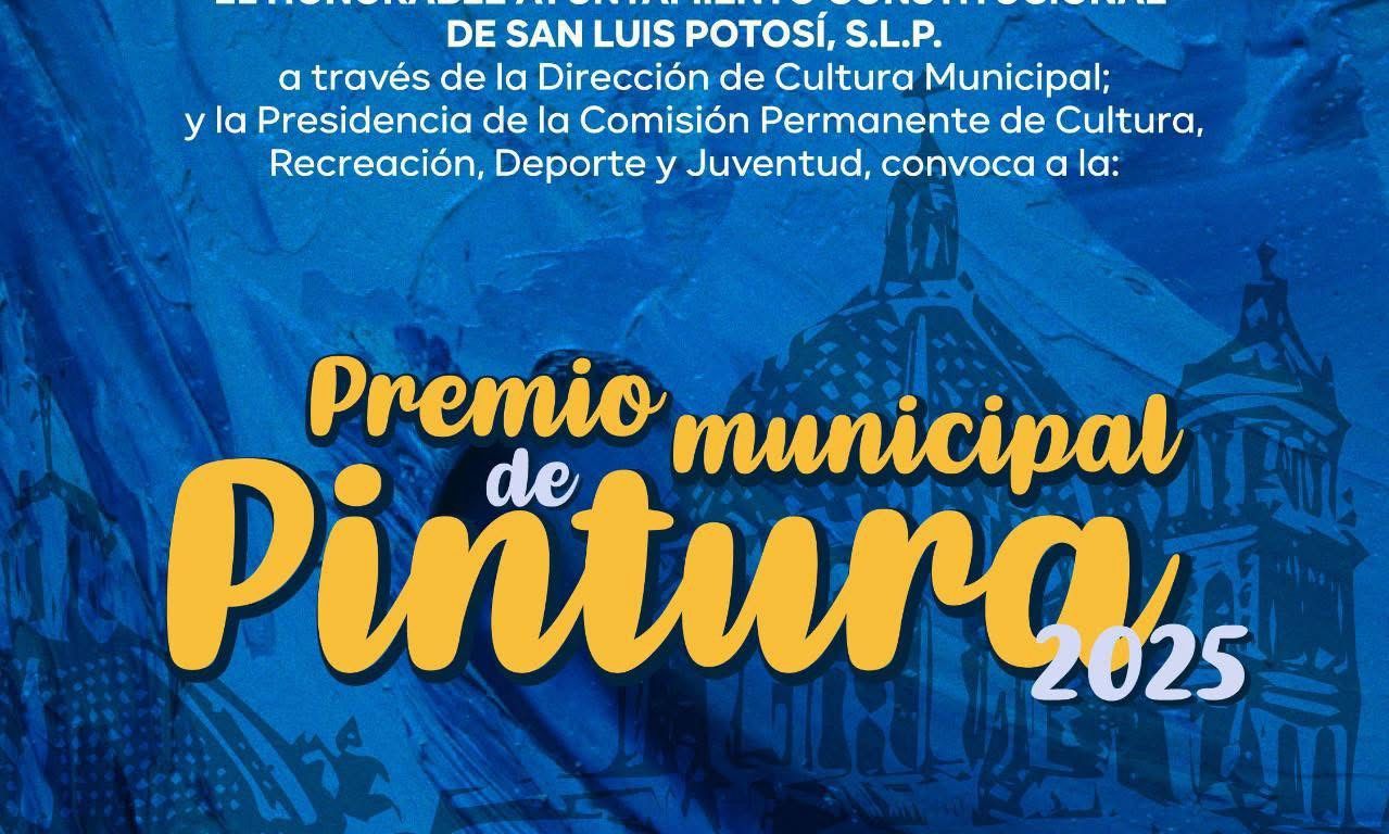 El Honorable Ayuntamiento Constitucional de San Luis Potosí, a través de la Dirección de Cultura Municipal y en coordinación con la Presidencia de la Comisión Permanente de Cultura, Recreación, Deporte y Juventud, convoca al Premio Municipal de Pintura 2025, como parte de las actividades conmemorativas por el 433 Aniversario de la Fundación de la Ciudad de San Luis Potosí.
