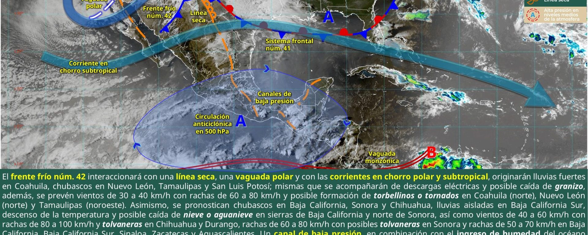 Viento de 30 a 40 km/h con rachas de 60 a 80 km/h y posible formación de torbellinos: Coahuila (noreste), Nuevo León (norte) y Tamaulipas (noroeste); con tolvaneras: San Luis Potosí, Aguascalientes y Zacatecas.