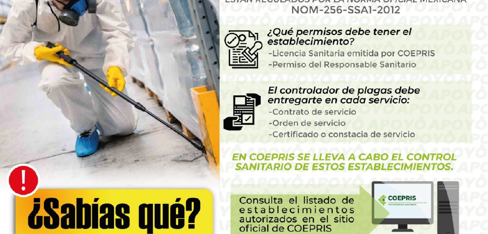 Es importante resaltar que en los establecimientos dedicados a brindar servicio de exterminio de plagas urbanas, se supervisa que cuenten con Licencia Sanitaria, que el personal esté capacitado en la aplicación de plaguicidas, los productos a utilizar tengan registro sanitario, no estén caducos y que se apliquen de acuerdo al uso (doméstico, urbano o de jardinería), que se proporcione al usuario una constancia o certificado del servicio, donde se especifique indicaciones y medidas de seguridad antes, durante y después de la fumigación y que ésta constancia, esté firmada por el técnico aplicador y responsable sanitario del establecimiento.