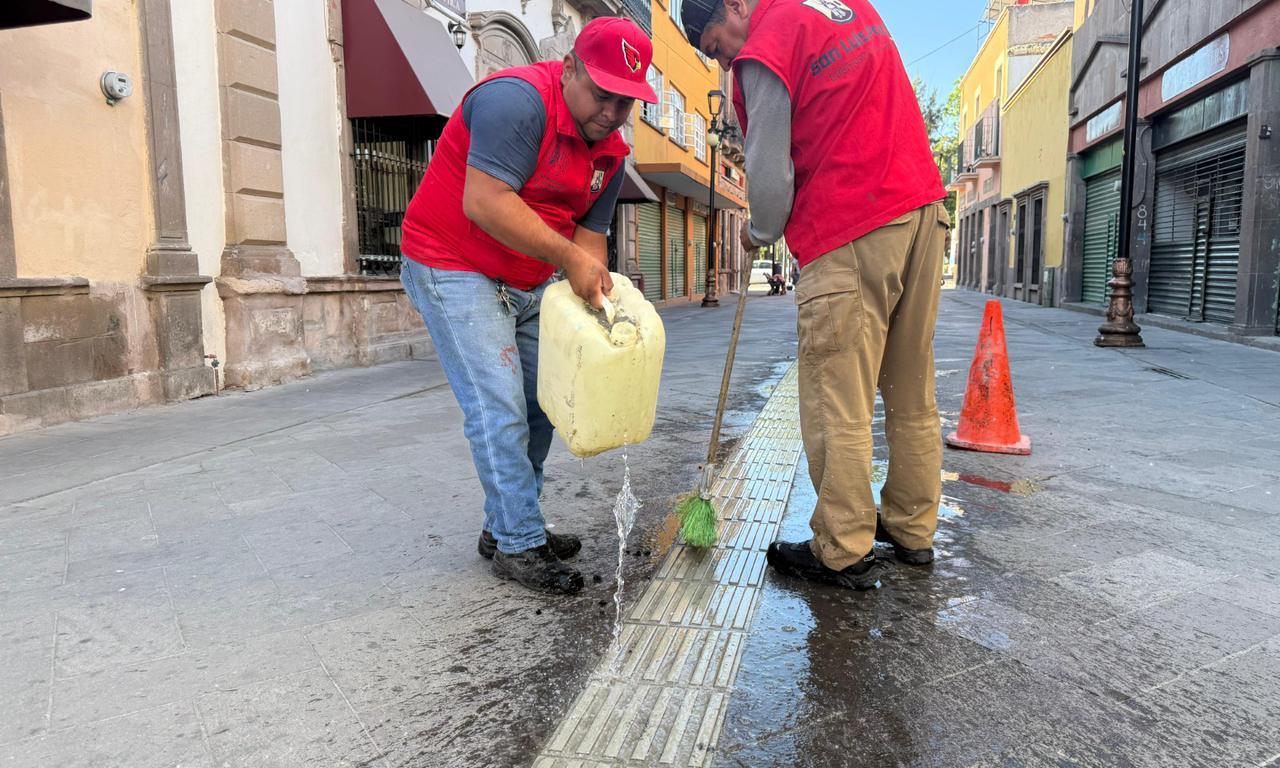 El equipo de Respuesta Inmediata de la Unidad de Gestión del Centro Histórico (UGCH) realizó labores de limpieza en la línea podotáctil ubicada entre la calle Comonfort y Calzada de Guadalupe, en pleno corazón de la Capital potosina.
