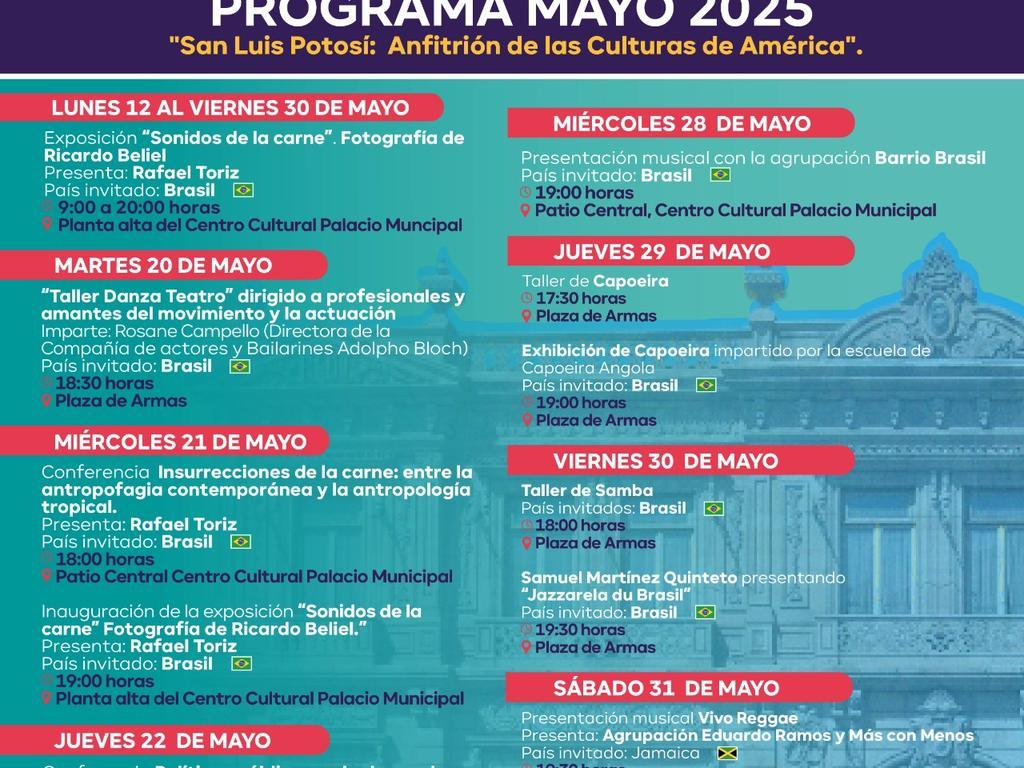 Así lo indicó Héctor Ulises Tello Balderas, encargado de la Dirección de Cultura Municipal, quien dijo que, en el marco de Capital Americana, durante el mes de mayo se han programado una serie de conferencias, talleres, exposición, muestra artesanal y presentaciones musicales de Brasil y Jamaica.