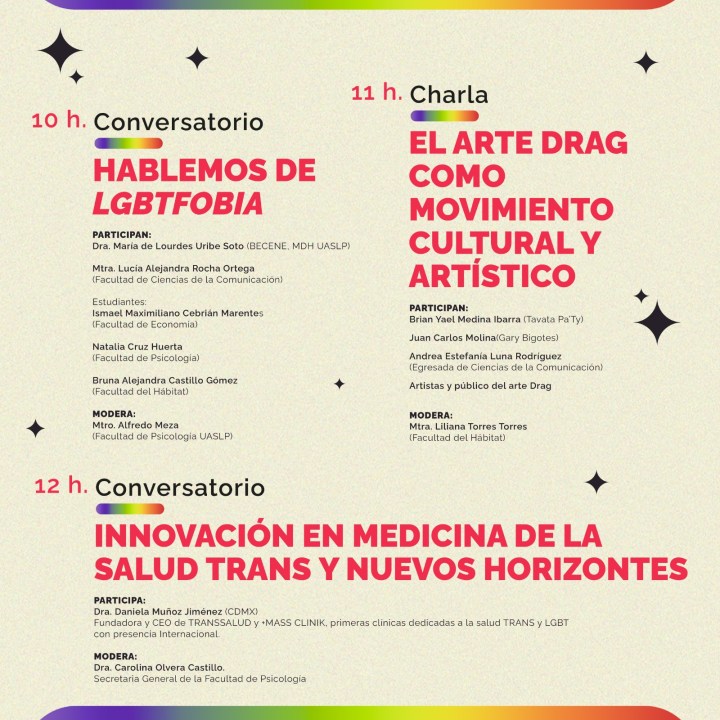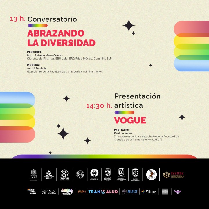 Otras actividades programadas incluyen la charla “El arte drag como movimiento cultural y artístico”, los talleres “Salud mental: Depresión y ansiedad en entornos educativos” y “Arcoíris y Diversidad UASLP”, el set fotográfico “Iconicxs: rostros de la diversidad UASLP” y la exposición “Todoxs somos dioses”.