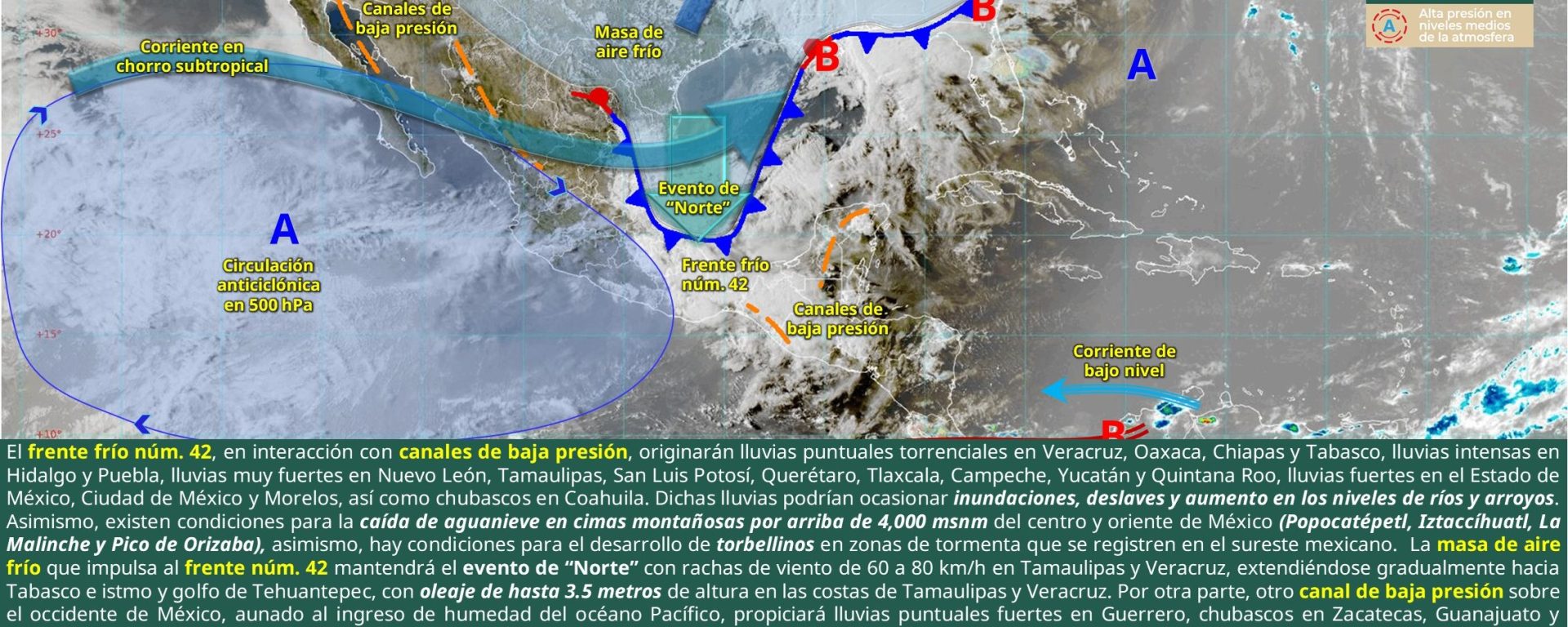 Evento de “Norte” de 50 a 60 km/h con rachas de 70 a 90 km/h: Veracruz, istmo y golfo de Tehuantepec (Oaxaca y Chiapas); de 20 a 30 km/h con rachas de 40 a 60 km/h: Tamaulipas, Tabasco, Campeche y Yucatán.