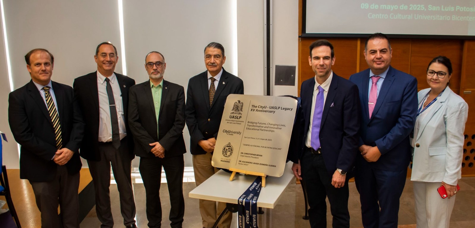Como parte de la ceremonia, también se develó una placa conmemorativa por el XV aniversario del programa, con la que la UASLP y CityU reiteraron su compromiso de trabajar para que más jóvenes accedan a esta oportunidad educativa internacional, orientada a formar profesionales para el mundo, con una visión global y herramientas que les permitan destacarse en cualquier parte del planeta.