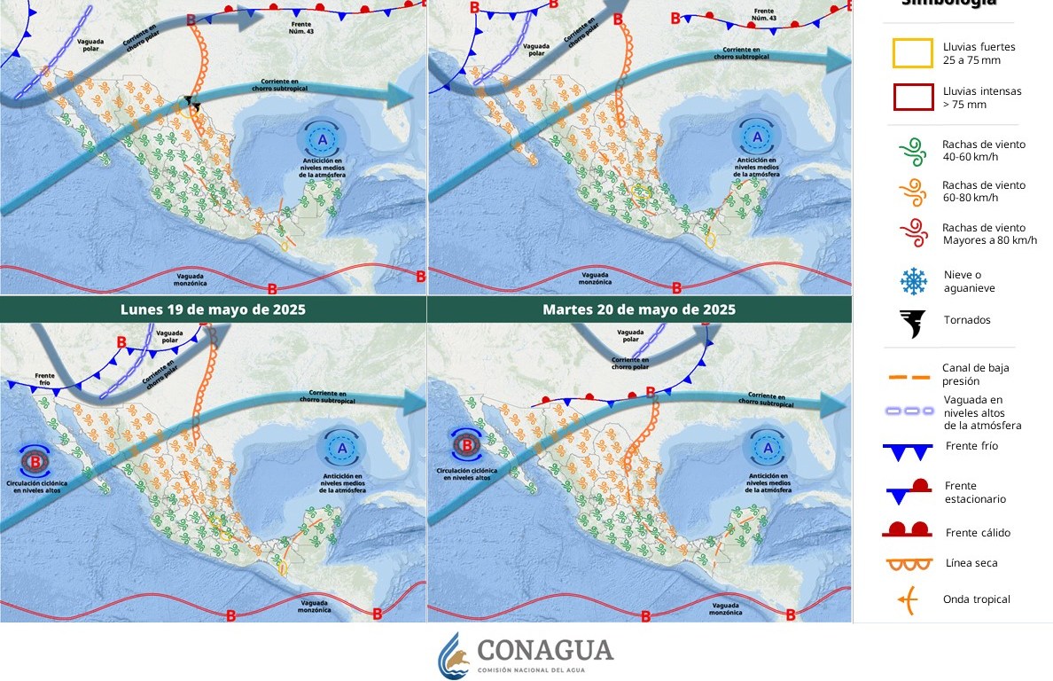 Cielo medio nublado a nublado durante el día, con lluvias puntuales fuertes en Coahuila, chubascos en Nuevo León y San Luis Potosí, así como lluvias aisladas en Zacatecas. Sin lluvia en el resto de la región. Por la mañana, ambiente fresco, y frío a muy frío en sierras de Chihuahua y Durango. Durante la tarde, ambiente caluroso a muy caluroso; prevaleciendo la onda de calor en Durango, Coahuila (centro y sur), Nuevo León (centro y sur), San Luis Potosí, Zacatecas y Aguascalientes. Viento de dirección variable de 30 a 40 km/h con rachas de 60 a 80 km/h y tolvaneras en Chihuahua. Viento de 20 a 30 km/h con rachas de 50 a 70 km/h y tolvaneras en Nuevo León; con posible formación de torbellinos en Coahuila. Rachas de 40 a 60 km/h y posibles tolvaneras en Durango, Zacatecas, San Luis Potosí y Aguascalientes.
