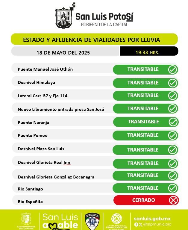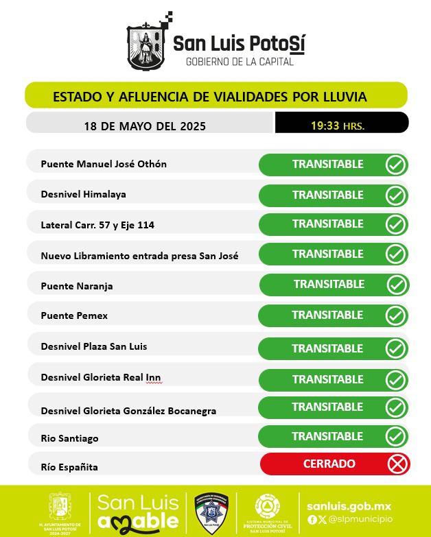 La Secretaría de Seguridad y Protección Ciudadana (SSPC) informa que, debido a la acumulación de agua provocada por las lluvias registradas esta tarde, se ha determinado el cierre vial en ambos sentidos de Río Españita.