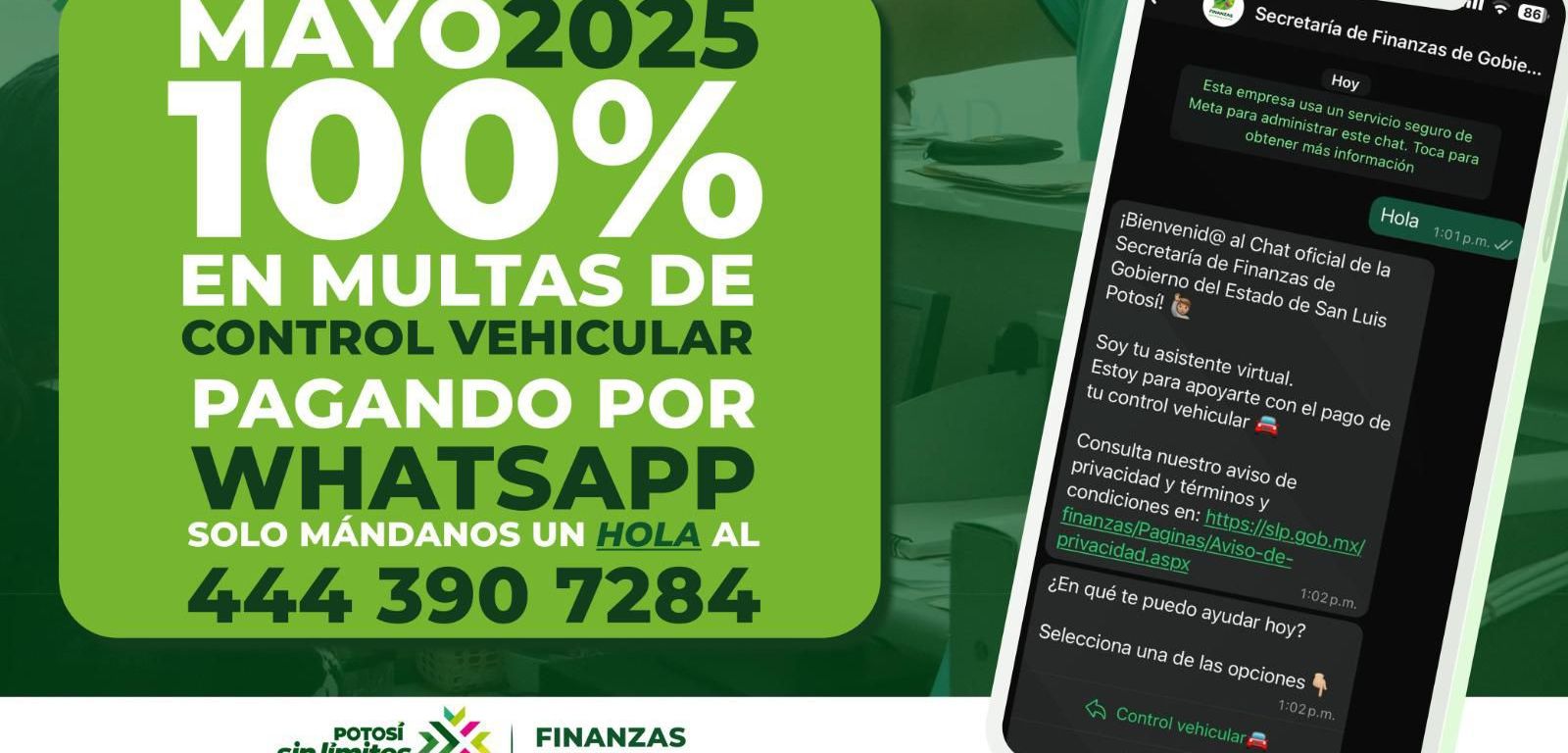 Invitó a las y los potosinos a aprovechar esta oportunidad y realizar sus pagos de forma rápida, segura y sin filas, y detalló que, para acceder al beneficio, solo es necesario enviar la palabra “Hola” al WhatsApp 444 390 7284, dónde un asistente virtual solicitará el número de placas del vehículo y mostrará los datos del adeudo, así como el monto a pagar. Posteriormente, proporcionará un enlace seguro de pago respaldado por Banco Santander y su tecnología 3D Secure.