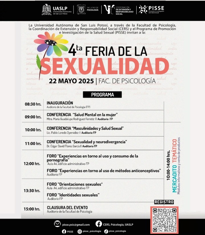 Este jueves 22 de mayo de 2025, la Facultad de Psicología de la Universidad Autónoma de San Luis Potosí (UASLP), a través del Programa de Promoción e Investigación de la Salud Sexual (PISSE) y del Centro de Extensión y Responsabilidad Social (CERS), llevará a cabo la 4ta. Feria de la Sexualidad, evento que contará con un programa que incluye conferencias, foros y la instalación de un mercadito temático, en un horario de 10:00 a 14:00 horas, con entrada libre.
