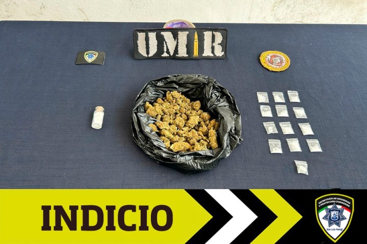 Al aproximarse a la zona, los agentes municipales encontraron una bolsa de plástico que en su interior contiene hierba verde seca con características de la marihuana, una botella pequeña de vidrio que en su interior contiene sustancia blanca en polvo con características del cristal, además de trece bolsas de plástico con una sustancia en polvo similar al cristal.