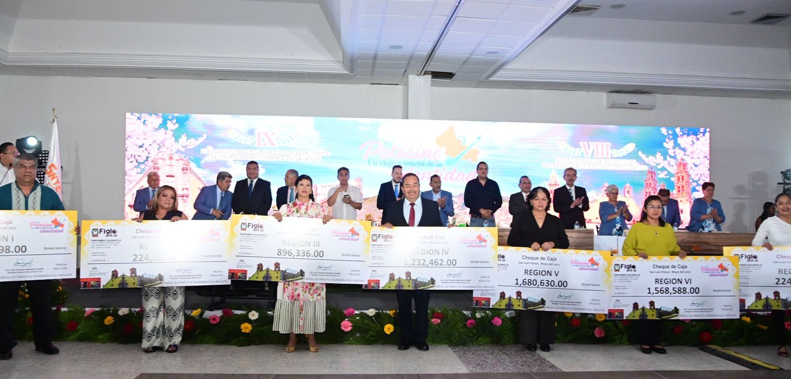 Este viernes 23 de mayo en la ciudad de San Luis Potosí se llevó a cabo el IX Evento de entrega de beneficios por cumplimiento de tiempo laboral necesario y VIII evento de pago del beneficio por retiro del sector educativo, ambos eventos fueron presididos por el Prof. Juan Carlos Bárcenas Ramírez secretario general de la Sección 26 del SNTE, acompañado del Prof. Manuel Arellano Mendez representante del CEN del SNTE y por integrantes de los Órganos de Administración y Gobierno de FIGLOSNTE 26. El monto entregado ascendió a $8.5 millones de pesos beneficiando con ello a 76 trabajadoras y trabajadores de la educación de las diferentes regiones del estado.