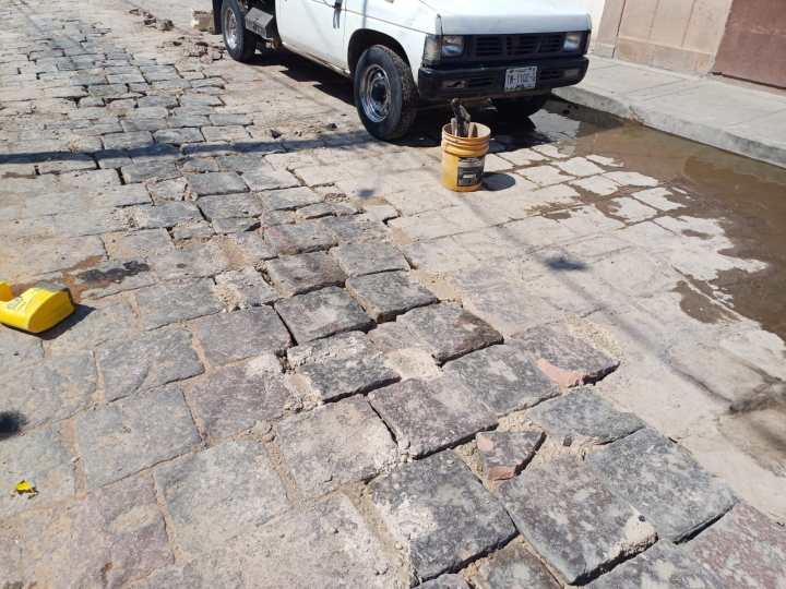 • El punto de reparación se encuentra en proceso de fraguado, debido a la colocación del adoquín original que requiere un tiempo específico para su secado.