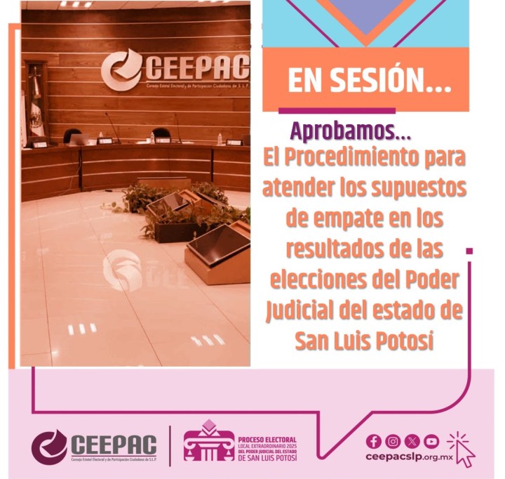 En sesión del Consejo General del Consejo Estatal Electoral y de Participación Ciudadana (CEEPAC), se aprobó el Procedimiento para atender los supuestos de empate en los resultados de las elecciones del Proceso Electoral Local Extraordinario 2025 para la elección de personas juzgadoras del Poder Judicial del estado de San Luis Potosí.