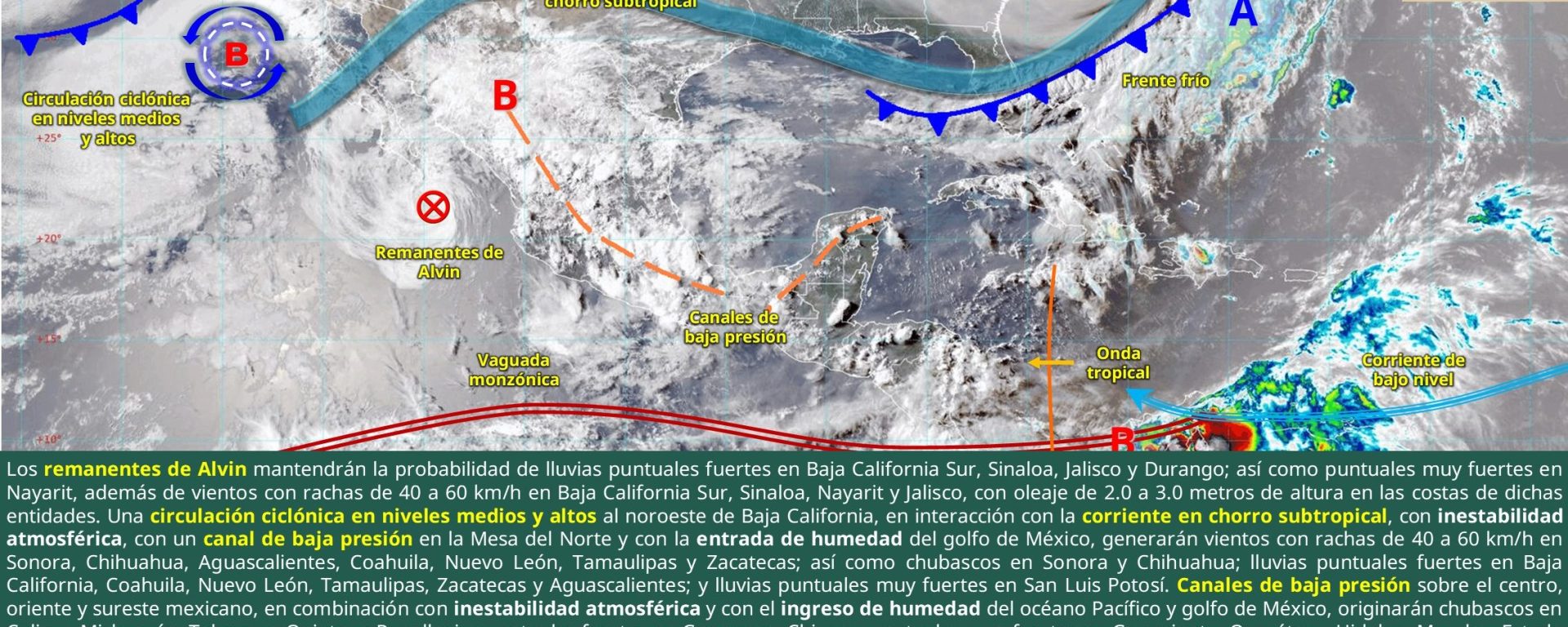 Oleaje de 2.0 a 3.0 metros de altura: costa occidental de Baja California Sur, costas de Sinaloa, Nayarit, Jalisco, Colima, Michoacán, Guerrero, Oaxaca y Chiapas.