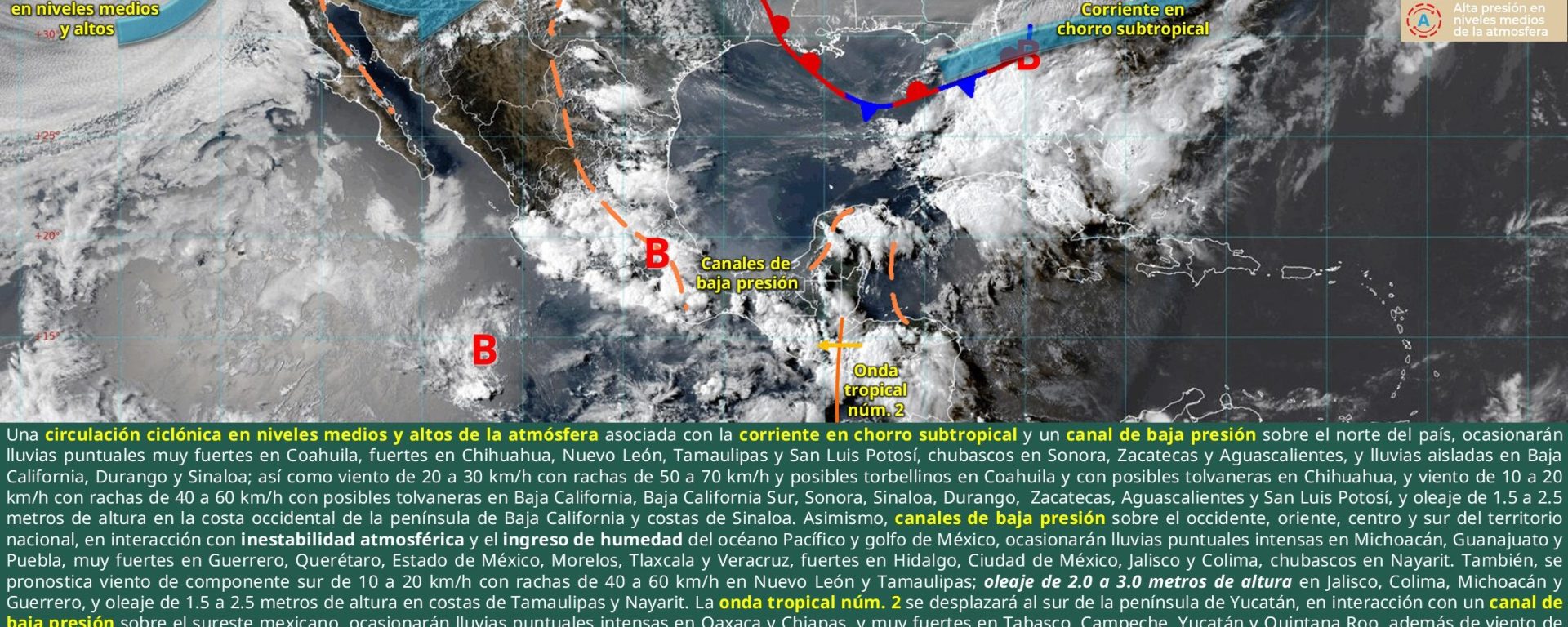 Chubascos con lluvias puntuales fuertes (25 a 50 mm): Coahuila, Nuevo León, Tamaulipas, Jalisco, Colima, Guanajuato, Estado de México, Ciudad de México y Tlaxcala.