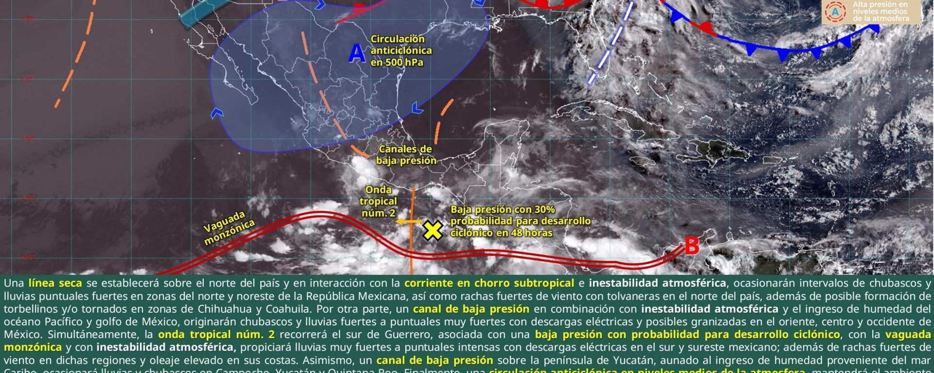 Viento de 30 a 40 km/h con rachas de 50 a 70 km/h y posibles torbellinos y/o tornados: Chihuahua (noreste y este) y Coahuila (noroeste y norte); y con tolvaneras: Nuevo León y Tamaulipas.