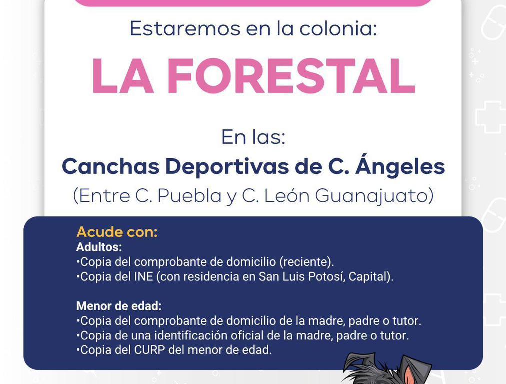 Por lo anterior este 10 de junio, La Ruta de la Salud 2.0 brindará atención en la colonia La Forestal, un horario de 09:00 a 13:00 horas. Para acceder a los servicios, los adultos deben presentar copia de comprobante de domicilio reciente y copia del INE con residencia en San Luis Potosí Capital. En el caso de menores de edad, se solicita comprobante de domicilio de la madre, padre o tutor, identificación oficial y CURP del menor.