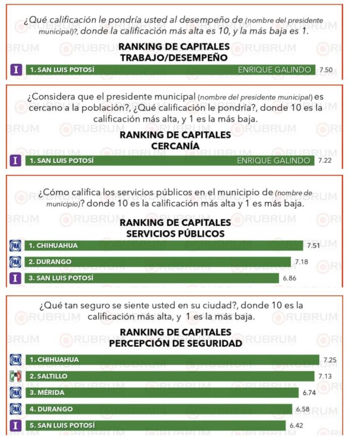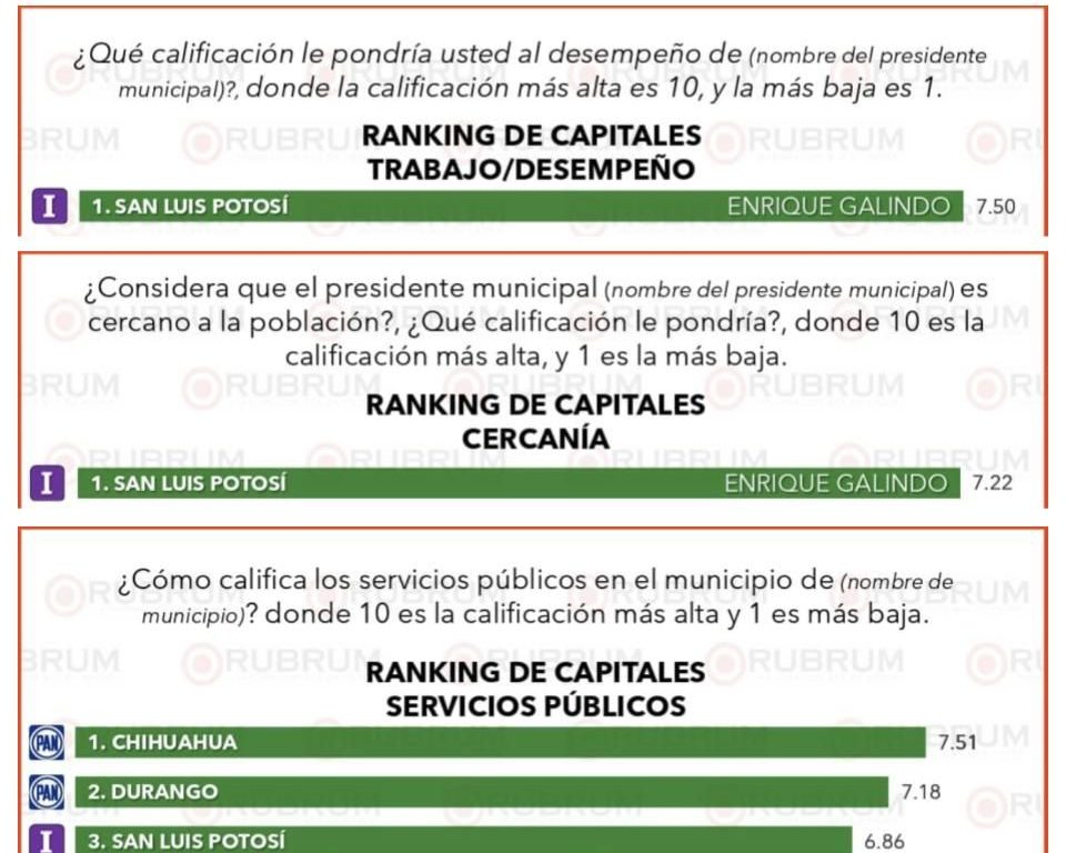 La empresa Rubrum, en su evaluación ciudadana en 31 capitales estatales correspondiente a junio de 2025, posicionó al Presidente Municipal Enrique Galindo Ceballos en el primer lugar gracias a la alta calificación de 7.50, otorgada por la población, debido a su trabajo y desempeño como Alcalde de la Capital potosina.