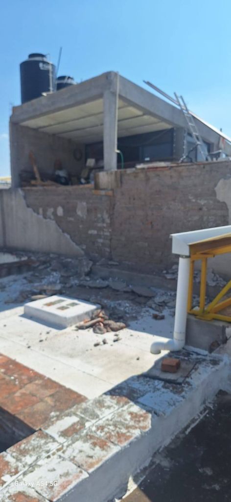 Personal del área de Construcción de esta dependencia realizó una inspección estructural tanto en el inmueble reportado como en el techo del centro de atención infantil, ya que parte del material desprendido cayó sobre sus instalaciones. Como medida preventiva, se delimitaron con cinta restrictiva las áreas comunes afectadas, con el fin de mitigar cualquier riesgo para los menores y el personal.