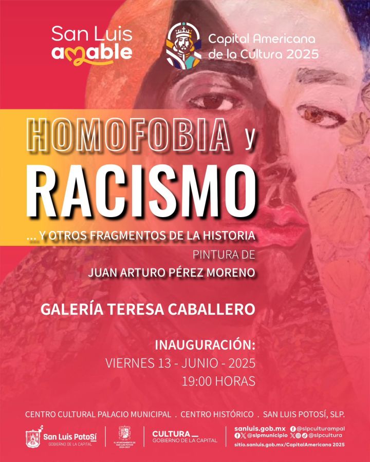 El Gobierno de la Capital, a través de la Dirección de Cultura Municipal invita a la inauguración de la exposición “Homofobia y racismo… y otros fragmentos de la historia”, con la obra pictórica de Juan Arturo Pérez Moreno, este próximo viernes 13 de junio a las 19:00 horas en el Centro Cultural Palacio Municipal.
