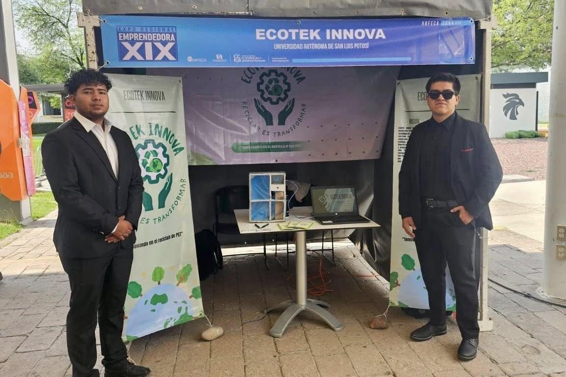 Michael Alexander González Martínez y Carlos García Tovar, estudiantes de Ingeniería Mecatrónica e Ingeniería Mecánica Administrativa en la Unidad Académica Multidisciplinaria Región Altiplano (UAMRA), obtuvieron el primer lugar en la categoría de Tecnología en la XIX Expo Regional Emprendedora Zona III ANFECA, con su proyecto “Ecotek Innova”.