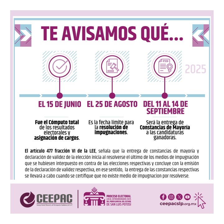 El Consejo General del Consejo Estatal Electoral y de Participación Ciudadana (CEEPAC) celebró la Sesión de Cómputos correspondiente a la elección extraordinaria de personas juzgadoras que integrarán el Poder Judicial del Estado de San Luis Potosí.