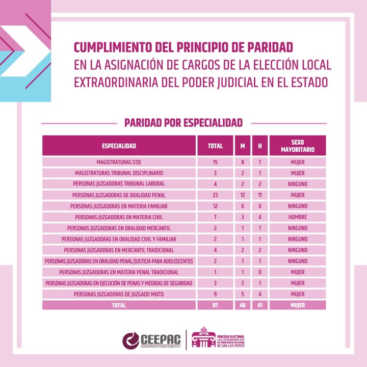 De los 87 cargos que componen la totalidad de la integración del poder judicial del estado de San Luis Potosí, que fueron sujetos al proceso electoral local extraordinario 2025, 46 serán ocupados por mujeres y 41 por hombres.