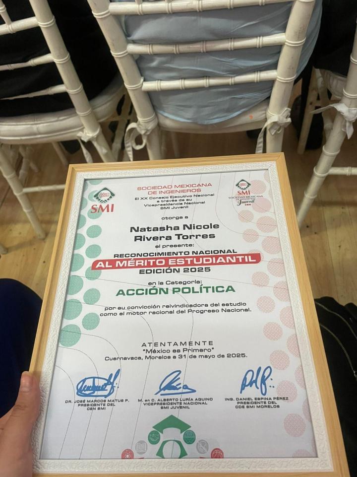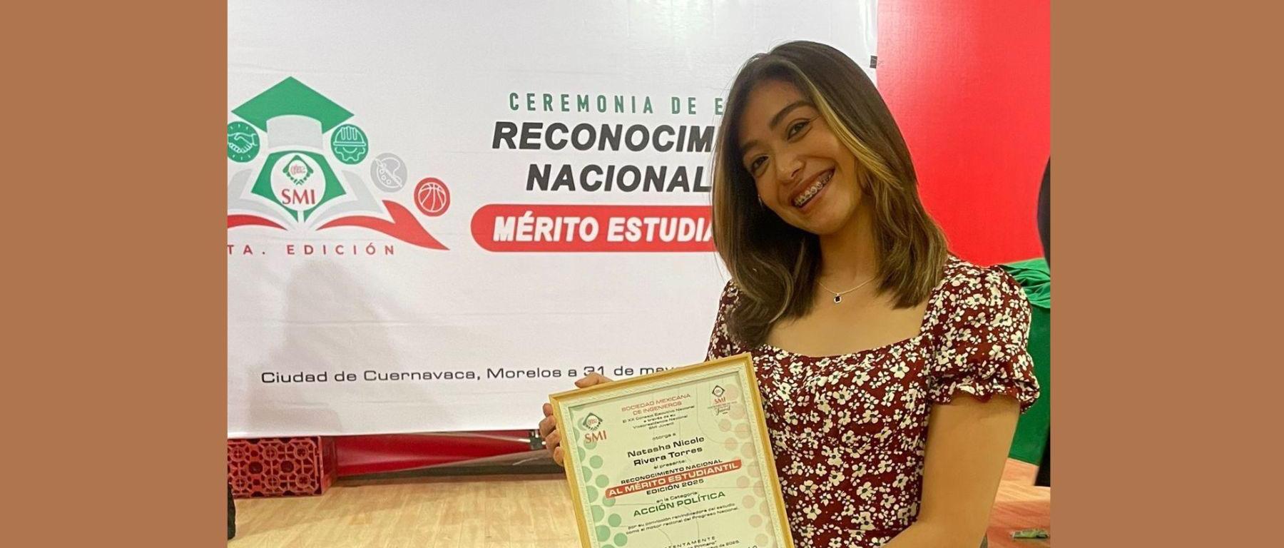 El XX Consejo Ejecutivo Nacional, a través de la Vicepresidencia Nacional de la Sociedad Mexicana de Ingenieros (SMI), Sección Juvenil, otorgó el Mérito Estudiantil 2025 en la categoría de Acción Política a Natasha Nicole Rivera Torres, alumna de la Licenciatura en Administración y Políticas Públicas de la Facultad de Contaduría y Administración (FCA) de la Universidad Autónoma de San Luis Potosí (UASLP).