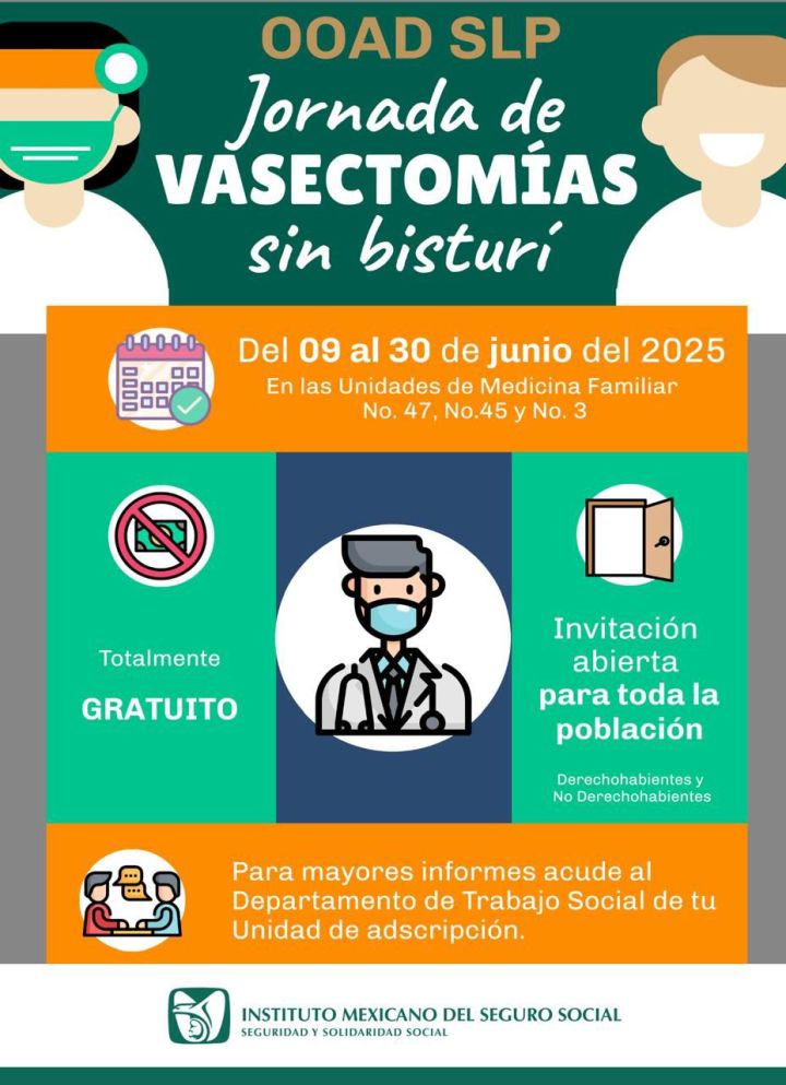 Invitó a las personas interesadas a la jornada de vasectomías del 9 al 30 de junio, en las Unidades de Medicina Familiar (UMF) No. 47 y No. 45 en la capital, y No. 3 en Ciudad Valles.