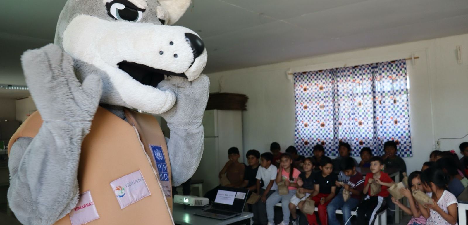 Las niñas y niños convivieron con un lobo mexicano (Canis lupus baileyi) y un perrito de la pradera (Cynomys ludovicianus),ambos animales protegidos en la zona de Janos que forman parte de las botargas que promueven la vigilancia solidaria del área natural protegida.