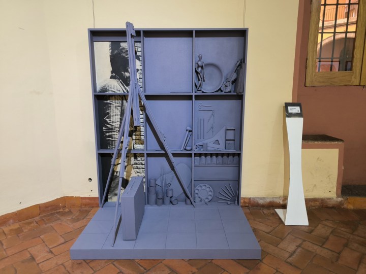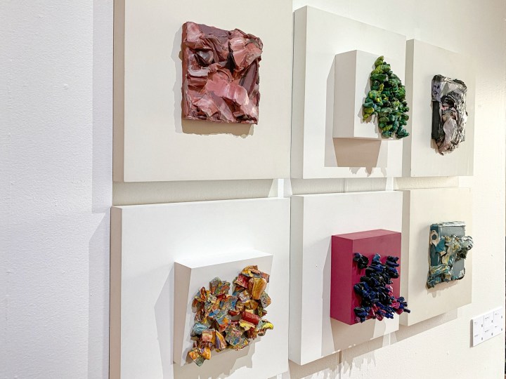 Destacó que la obra exhibida transita entre el arte objeto y la pintura, con una marcada presencia de geometría rítmica y una paleta de color donde predominan los azules.